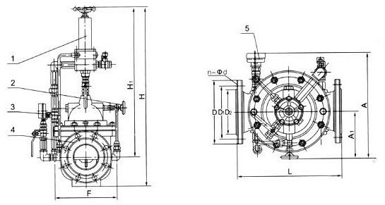 | DN | L | A | A1 | H | H1 | F | D mm | D1 mm | D2 mm | n-Φd | ||||||||